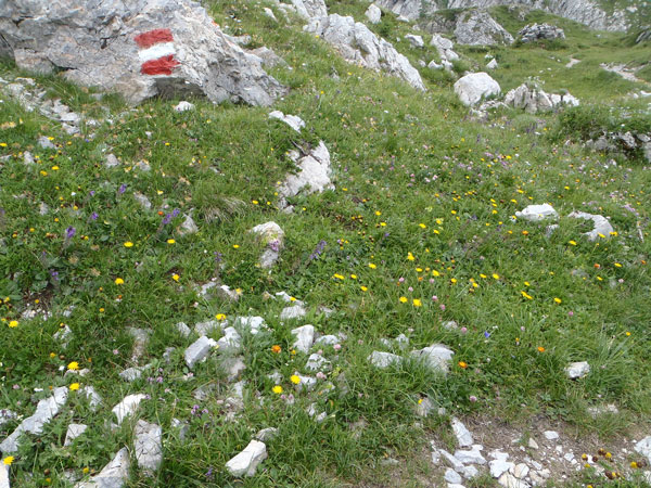 Es geht weiter auf fast ebenem Wege, u.a. über steil abfallende Schotterfelder, zum Giramondo-Pass. Hier passieren wir wieder die Grenze nach Österreich. Es geht über windige Hochalp-Flächen, und alsbald sehr steil hinab über blumige Wiesen hinab in das nächste Tal. Auf relativ ebenem Pfad gelangen wir über einen breiten Talgrund, vorbei an der Oberen Wolayeralm, auf einen geschotterten Fahrweg. Hinter der nächsten Ecke, im Talschluss, erwarte ich dann endlich die Wolayer-See-Hütte. Diese lässt jedoch auf sich warten, ebenso der gleichnamige See: ein letztes Mal geht es bergauf auf die nächste Talstufe. Es beginnt zu regnen und wird sehr stürmisch. Was mir aber nichts ausmacht, da es das erste Mal ist, während unserer Wanderung. Ich finde es eher wild-dramatisch.